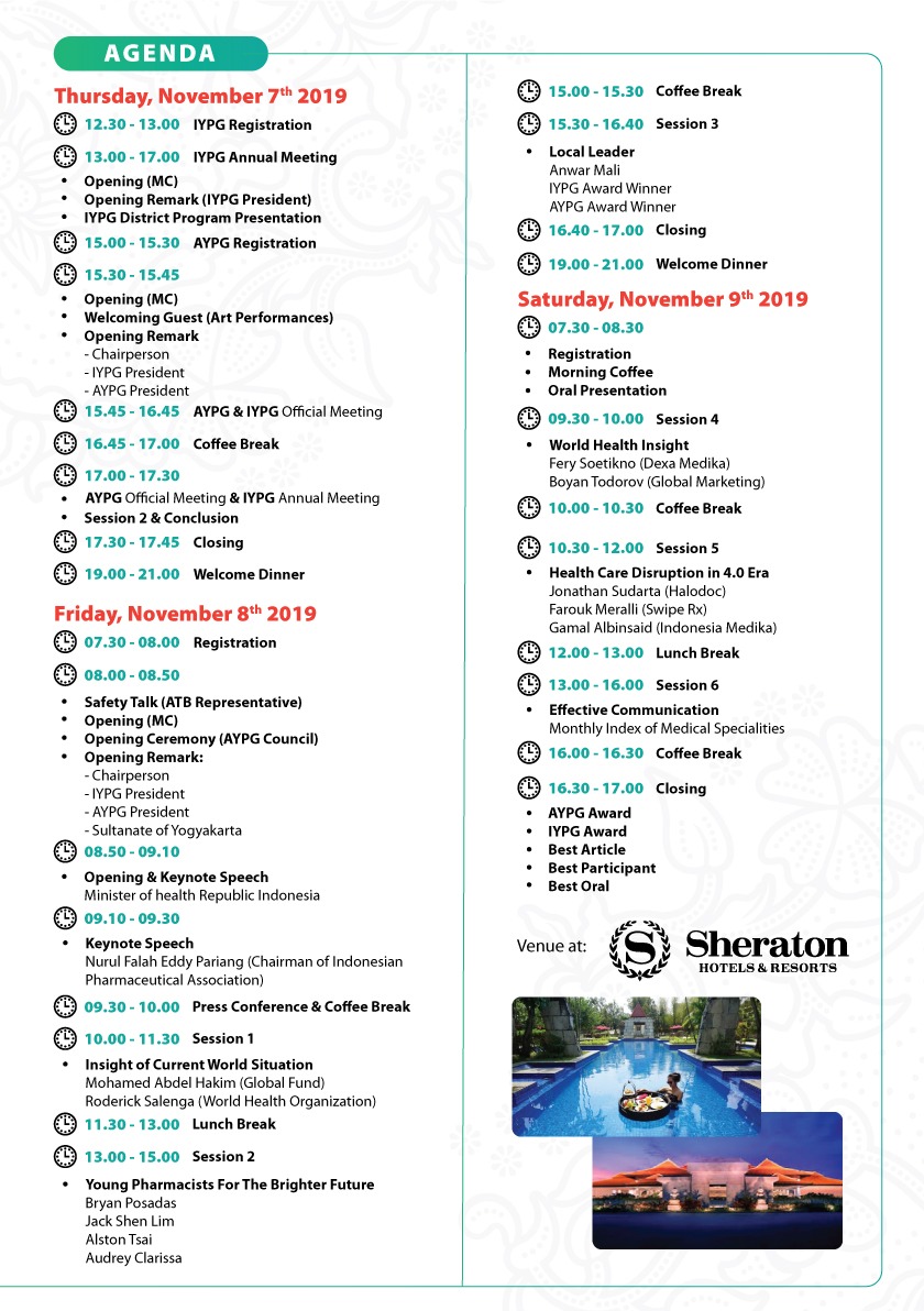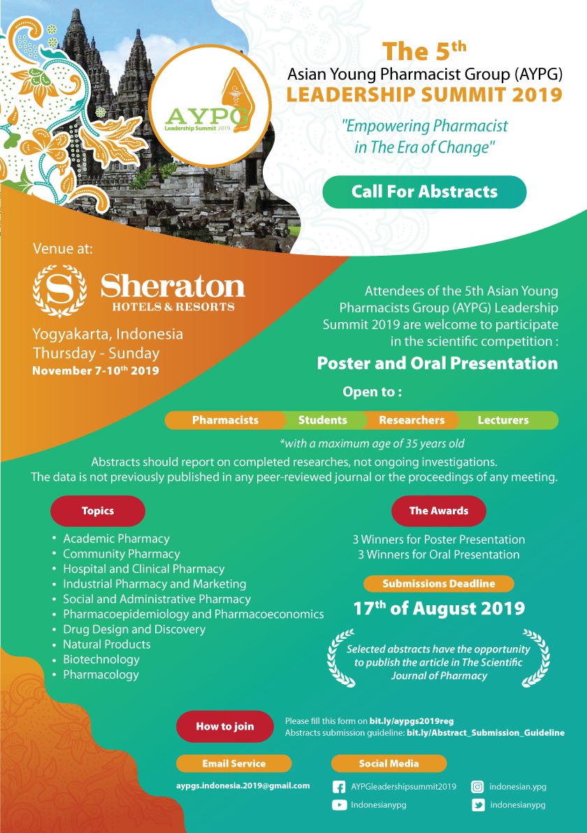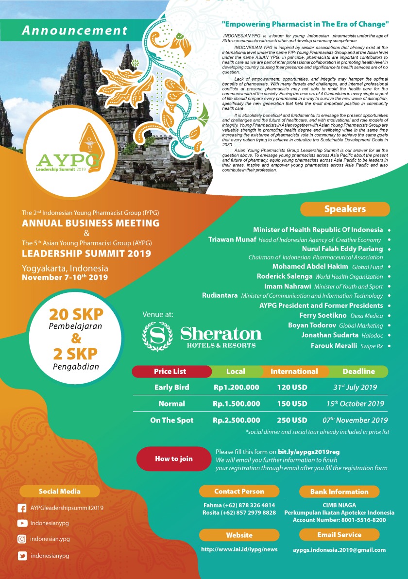 Please SAVE THE DATE and join Asian Young Pharmacists Group Leadership Summit 2019 on November 7-10th, 2019, at Sheraton Hotel and Resorts, DI Yogyakarta, Indonesia.